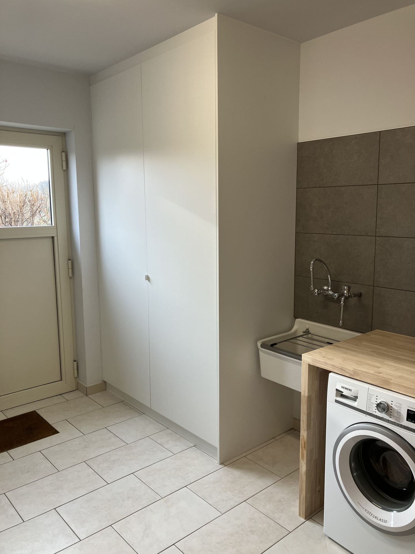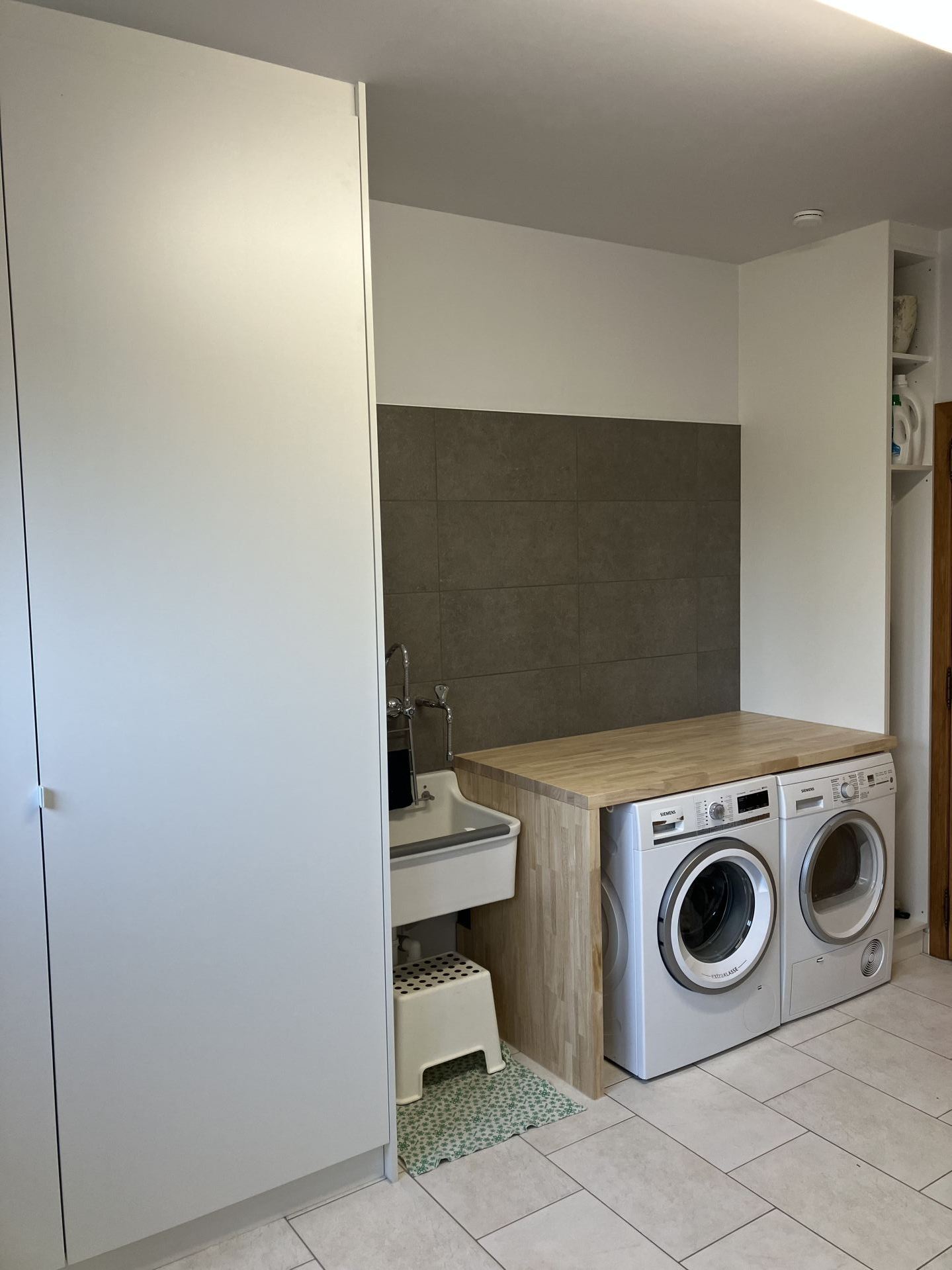 Daarnaast hebben we een tablet geplaatst boven wasmachine en droogkast en ook de muur erboven betegeld.