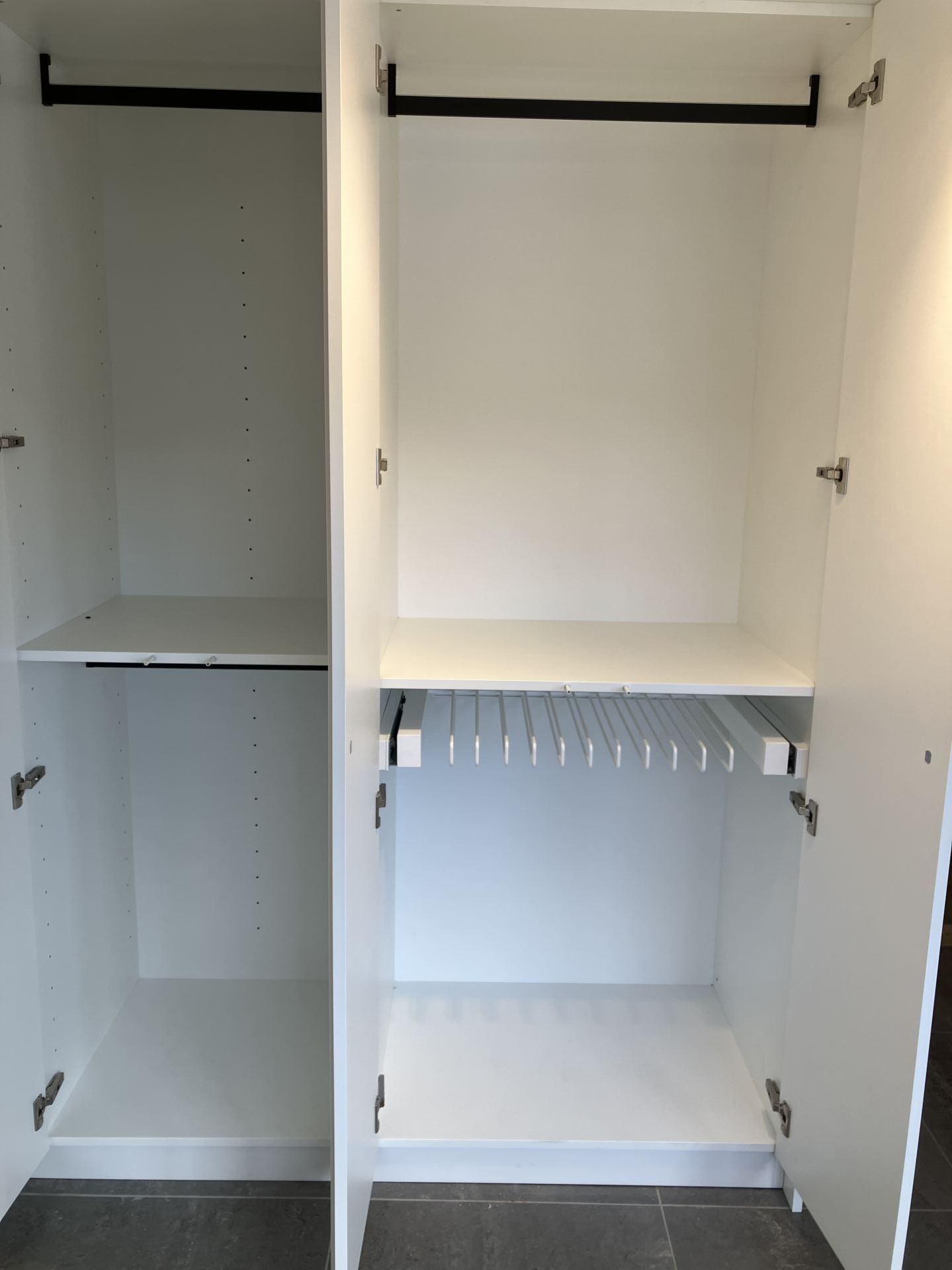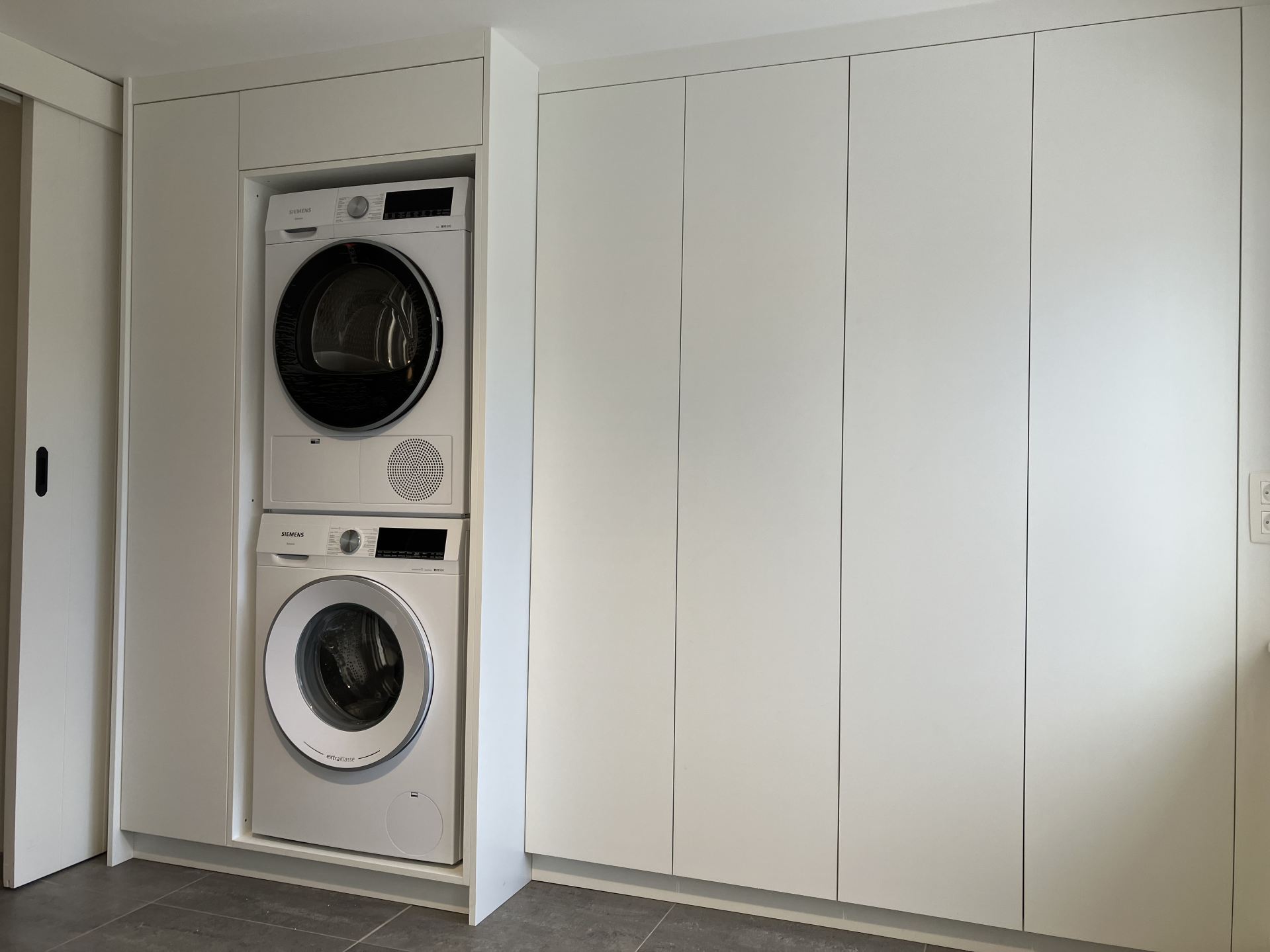 Wij hebben enkele aanpassingen gedaan aan de elektriciteit en vervolgens kasten op maat geplaatst: een dressing kast in L opstelling en een bergingkast met ingebouwde machines.